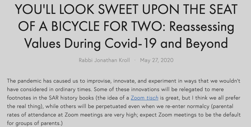 Rabbi Shmuel Hain has been asking his shul members to share reflections on our current situation. Here’s what I shared with our shul for שבת הגדול: